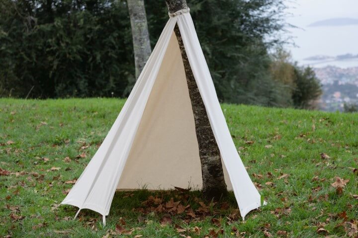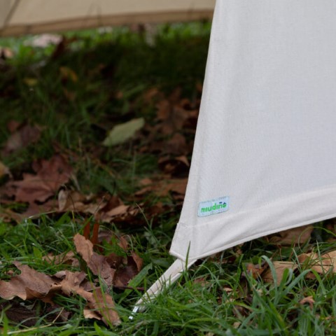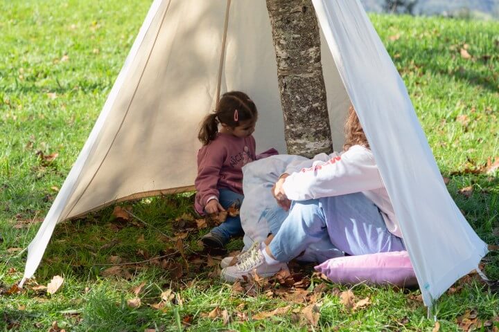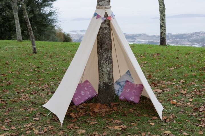 A choza abraza-árbores de Miudiño é un elemento de xogo que, rodeando unha árbore, forma unha estancia onde acubillarse. Realizada artesanalmente en tea de loneta.