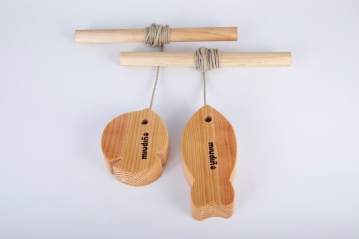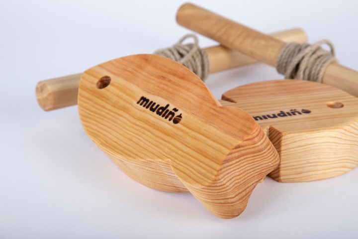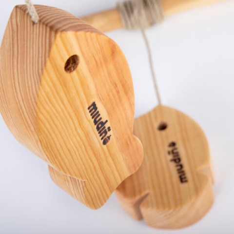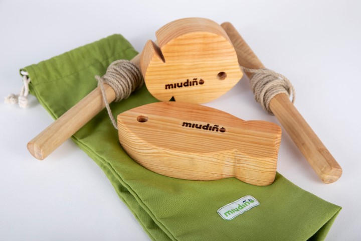 A carreira de peixes de Miudiño é un xogo de habilidade motriz, realizado artesanalmente en madeira de piñeiro tratada con aceites naturais e cordel.