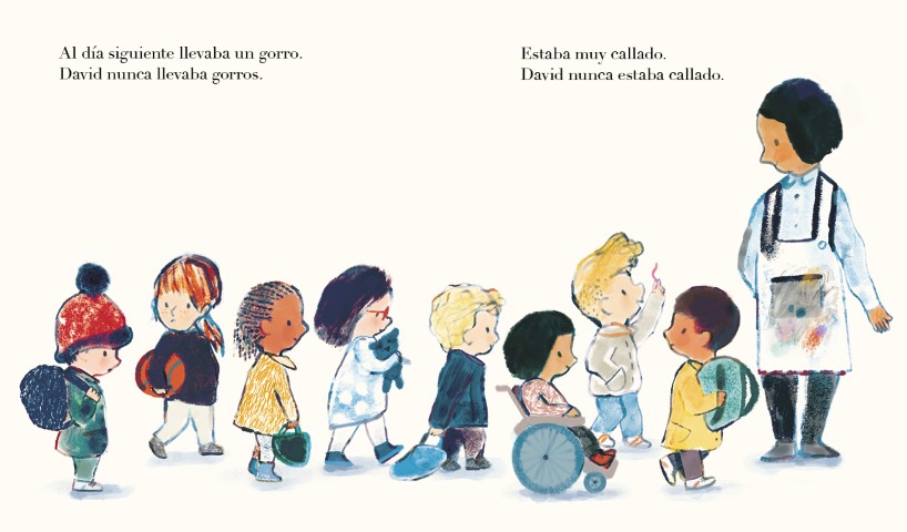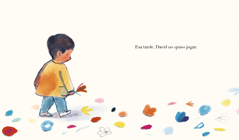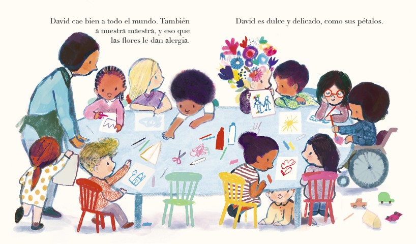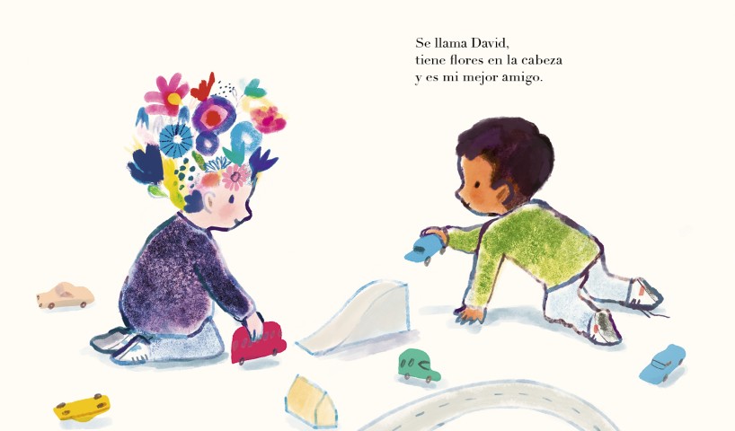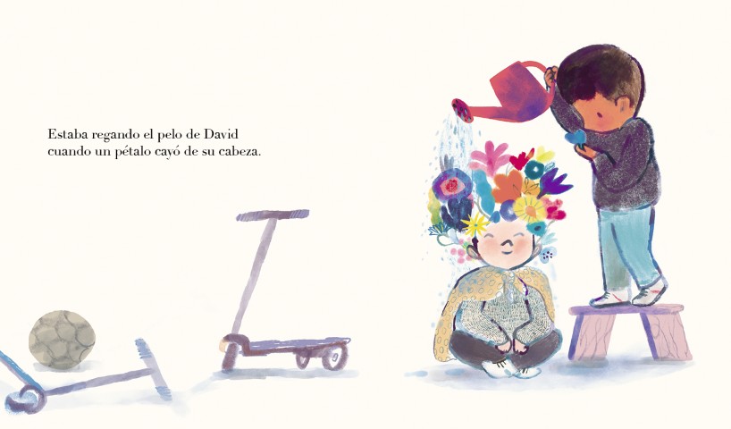 En la cabeza de David hay miles de flores de bonitos colores. David le cae bien a todo el mundo porque es como sus pétalos, dulce y delicado.