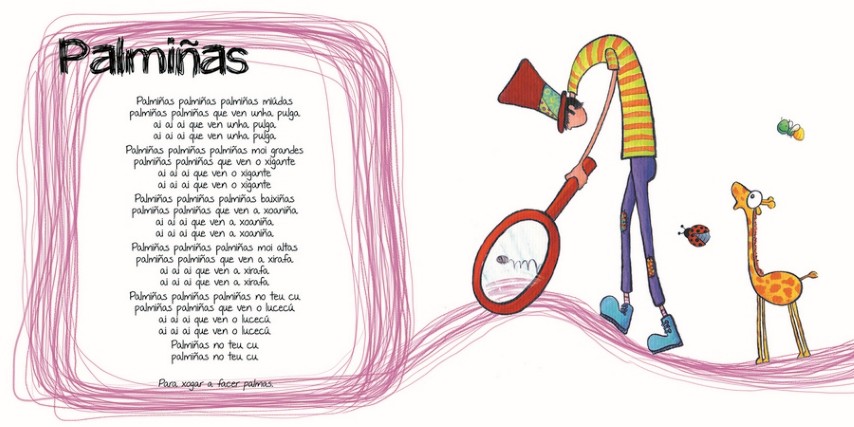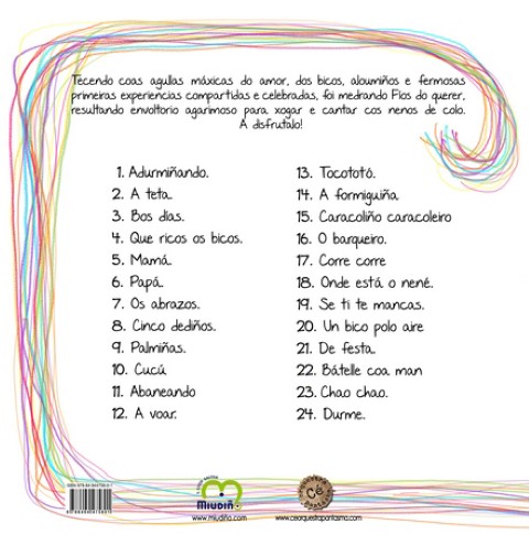 Conten 24 temas entre os que se atopan «que ricos os bicos», «palmiñas» ou «de festa». Temas que podedes escoitar na páxina da editora Miudiño S.Coop. Galega.