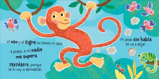 - Un libro «irreverente» donde los peques tienen que presionar botones de sonido para descubrir ruidos graciosos (sí, básicamente sonidos de «pedete») que hacen diferentes animales de la selva.